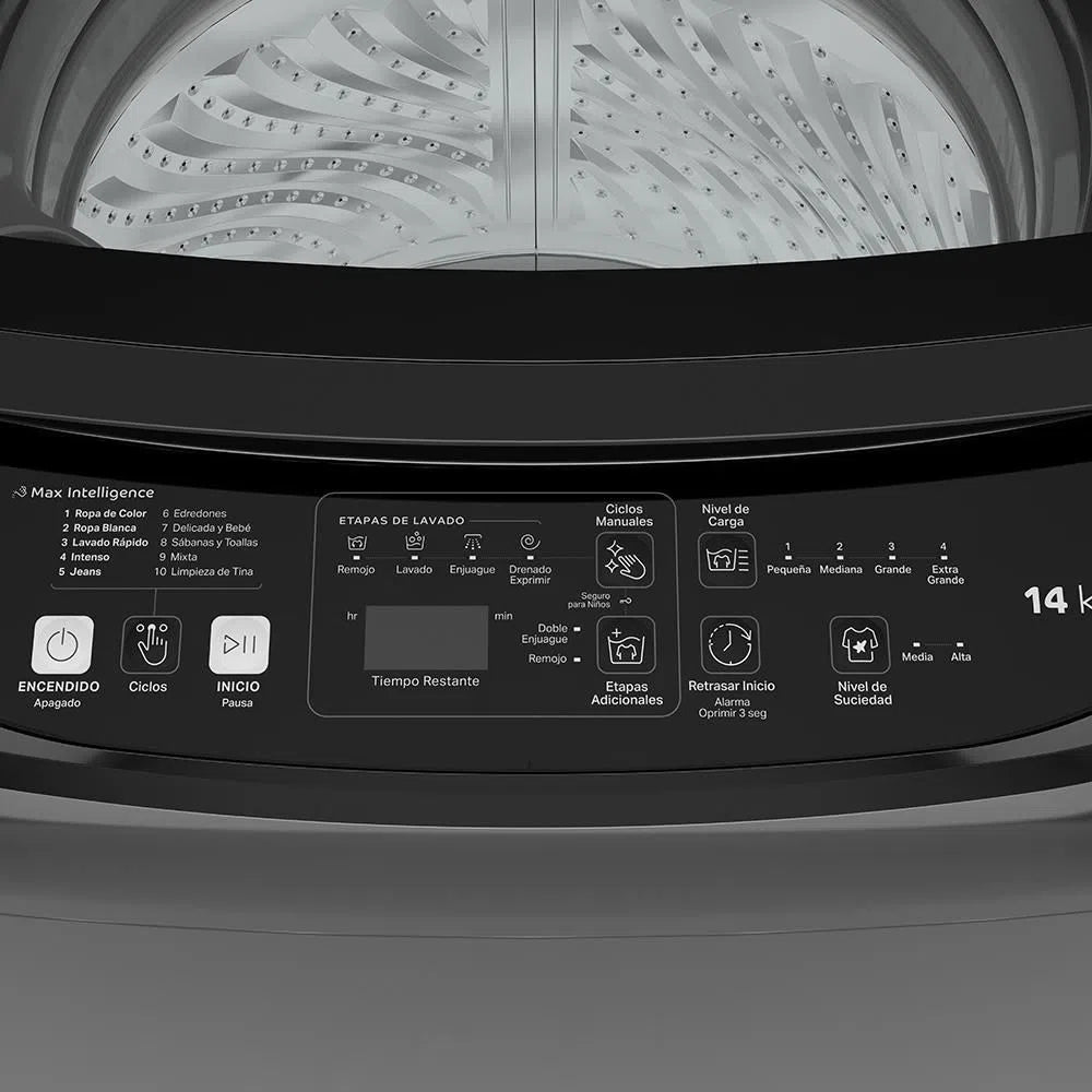 Lavadora ACROSS Carga Superior 14KG WA14RNAHLA Negro, con Max Intelligence, que ajusta la cantidad de agua según el peso de la carga para ahorrar hasta 20 litros en cada carga. Además, opción de llenado manual para la presión baja del agua, lavado profundo para una mejor limpieza de tus prendas, 4 tamaños de carga, 10 ciclos automáticos, 2 opciones de lavado, 2 depósitos automáticos y canasta 100% de acero inoxidable. No lo pienses mas ¡Adquiere la tuya ahora!