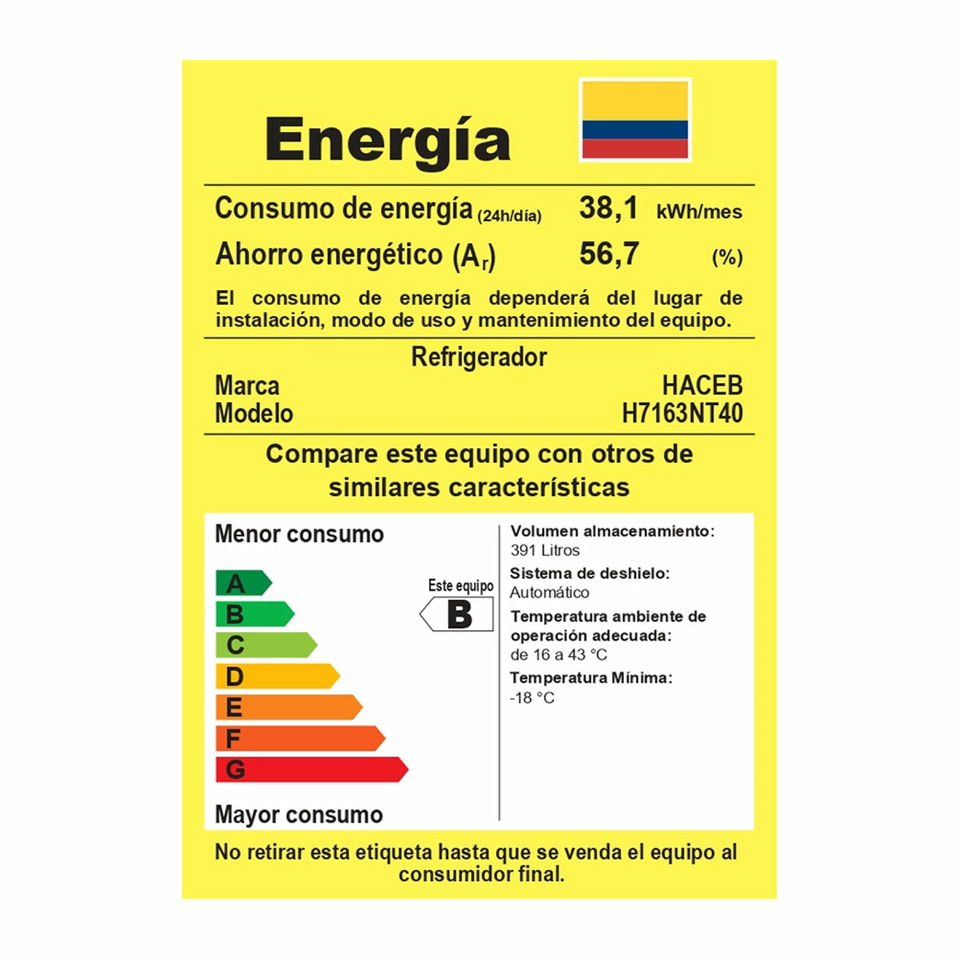 La Nevera HACEB no Frost de 391 Litros, La mejor combinación de diseño, potencia, eficiencia y capacidad. Máxima potencia y bajo consumo de energía*.Nevera clase T, apta incluso para los climas más calientes, con control interactivo y 5 niveles de temperatura, función de congelamiento rápido y alarma de puerta abierta.